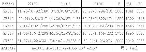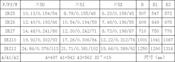 表4、SRZ散熱器散熱面積F(m2),通風(fēng)凈截面積Ff(m2),參考重量W(Kg),有關(guān)尺寸(mm)一覽表