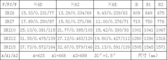 表6、SRZ散熱器散熱面積F(m2),通風(fēng)凈截面積Ff(m2),參考重量W(Kg),有關(guān)尺寸(mm)一覽續(xù)表